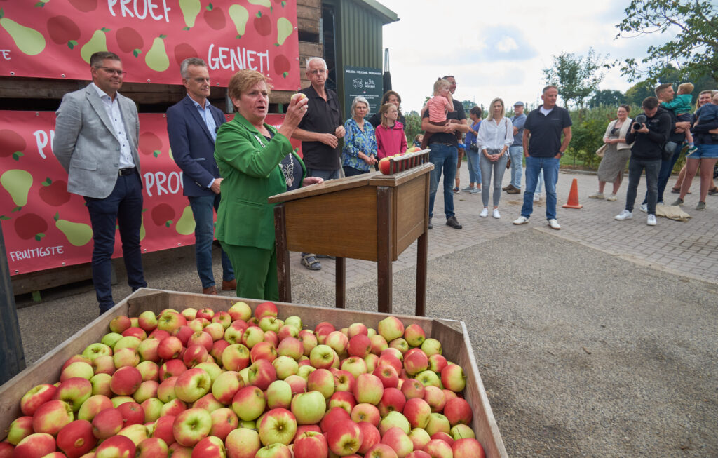 Burgemeester Nelly Kalfs deed de formele aftrap van de Hardfruitdagen, die De Fruitigste op acht locaties in Gelderland, en verder in heel Nederland, ondersteunt. Kalfs nam een eerste hap van een appel.”Ik hoop dat we voortaan bij het eten van een appel niet alleen de smaak genieten, maar ook meer weten van de aandacht en de passie die nodig is dit om mooie fruit op tafel te krijgen.”