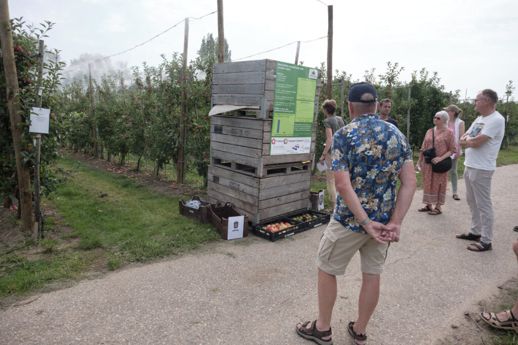 Hans van Ewijk van TS Group legde het systeem in de proefrijen op Randwijk aan. “Het is een robuust systeem, dat we ook al elders hebben geleverd. In Buren is het bij een kersenteler onder een overkapping gebruikt, en die behaalde heel mooi resultaat. Dit jaar is het weer heel anders dan in het eerste jaar van de proef op Randwijk, we kunnen nu pas goed beoordelen wat het effect op de appeloogst is. Wij zijn overtuigd van de werking van het systeem, maar je moet dat wel duidelijk kunnen aantonen. We zijn blij dat we die kans hebben gekregen. Ik denk dat de waterbesparing ook het Waterschap Rivierenland zal interesseren, het schap is mede-financier van de proef.”