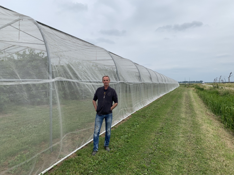 Gerrit: “Bij de meeste percelen pas ik het gaas toe. Als je het perceel eenmaal dicht hebt, beschermt het je tegen nieuwe vliegen. Na de eerste bespuiting ben je direct al minder vatbaar voor de suzuki-fruitvlieg. Een heel groot voordeel nu is dat we langer wachten met de volgende bespuiting. Zonder de netten of met hagelnetten moet je om de 7 dagen spuiten. Met deze netten kun je misschien wel om de 10 dagen spuiten. Zelf experimenteer ik de aankomende tijd hier ook mee. Misschien blijkt volgend jaar wel dat het spuiten prima kan om de 12 dagen. Het zou nog mooier zijn als we na de eerste bespuiting maar 1 keer hoeven te spuiten. Dan houd je echt geld in je zak. Dat is overigens voor mij niet het belangrijkst. De lagere inzet van gewasbeschermingsmiddelen is wat mij betreft de grootste winst van dit project.”