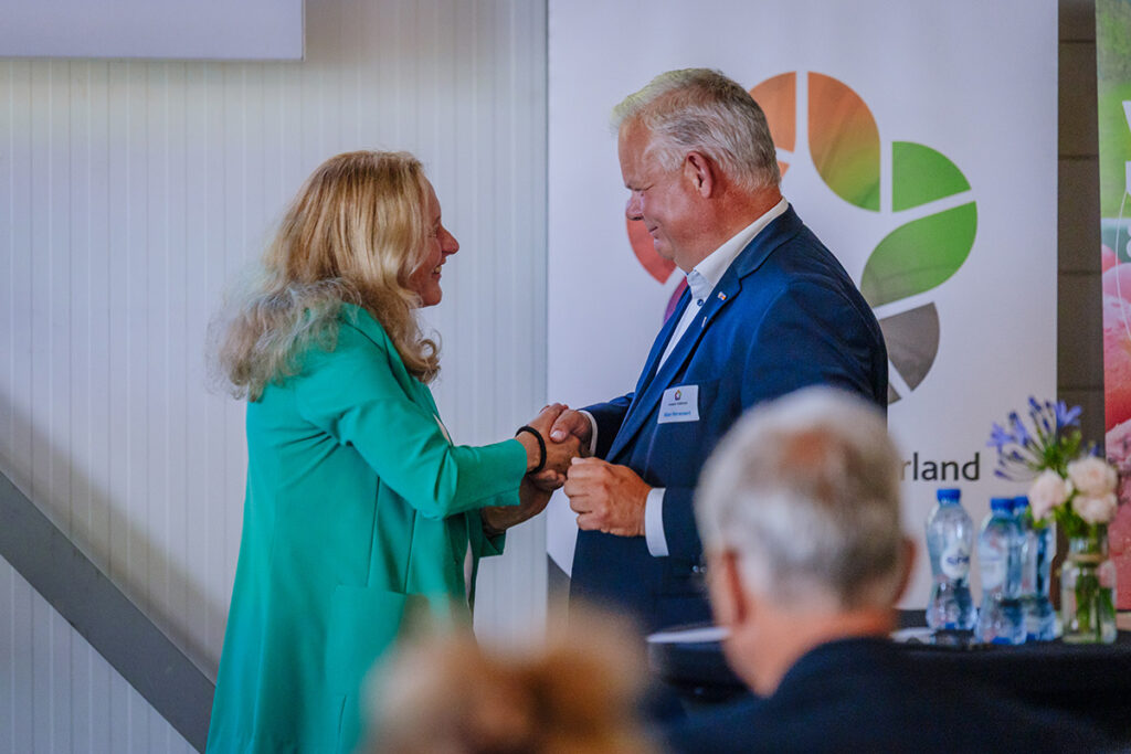 Voorzitter Rian Verwoert nam aan het slot van de bijeenkomst afscheid van Greenport Gelderland, hij wordt opgevolgd door Erik Stuurbrink uit Opheusden, tevens vakgroepvoorzitter van LTO Bomen, vaste planten en zomerbloemen.