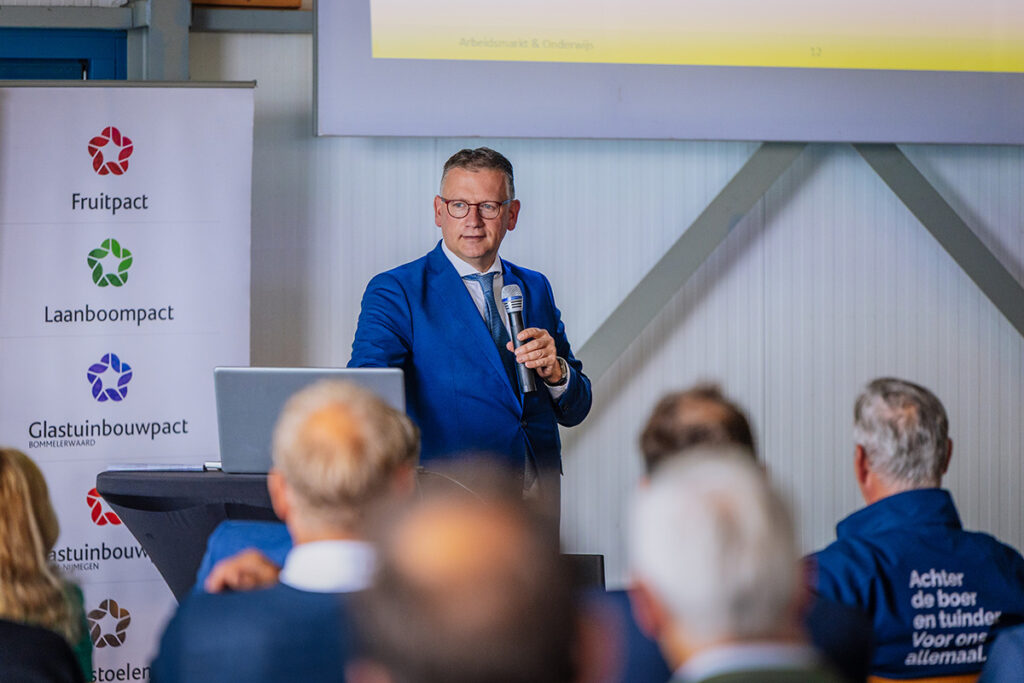 Gedeputeerde Harold Zoet had vooral lof voor de aanwezige deelnemers in Greenport Gelderland. Hij vindt de tuinbouw een belangrijke sector van de Gelderse economie. “Maar het is niet allemaal halleluja. We moeten hard werken aan innovatie, steeds minder toegestane gewasbescherming, kennisontwikkeling, biodiversiteit en bodemgezondheid. Het mooie is, dat dit allemaal van onderop wordt gedaan, met behulp van projectgelden van Greenport Gelderland. Daarom zeg ik: hou elkaar vast, laat het samenwerken van de pacten doorgaan, zeker in deze turbulente tijden. Daarin wil Provincie Gelderland een partner zijn.”